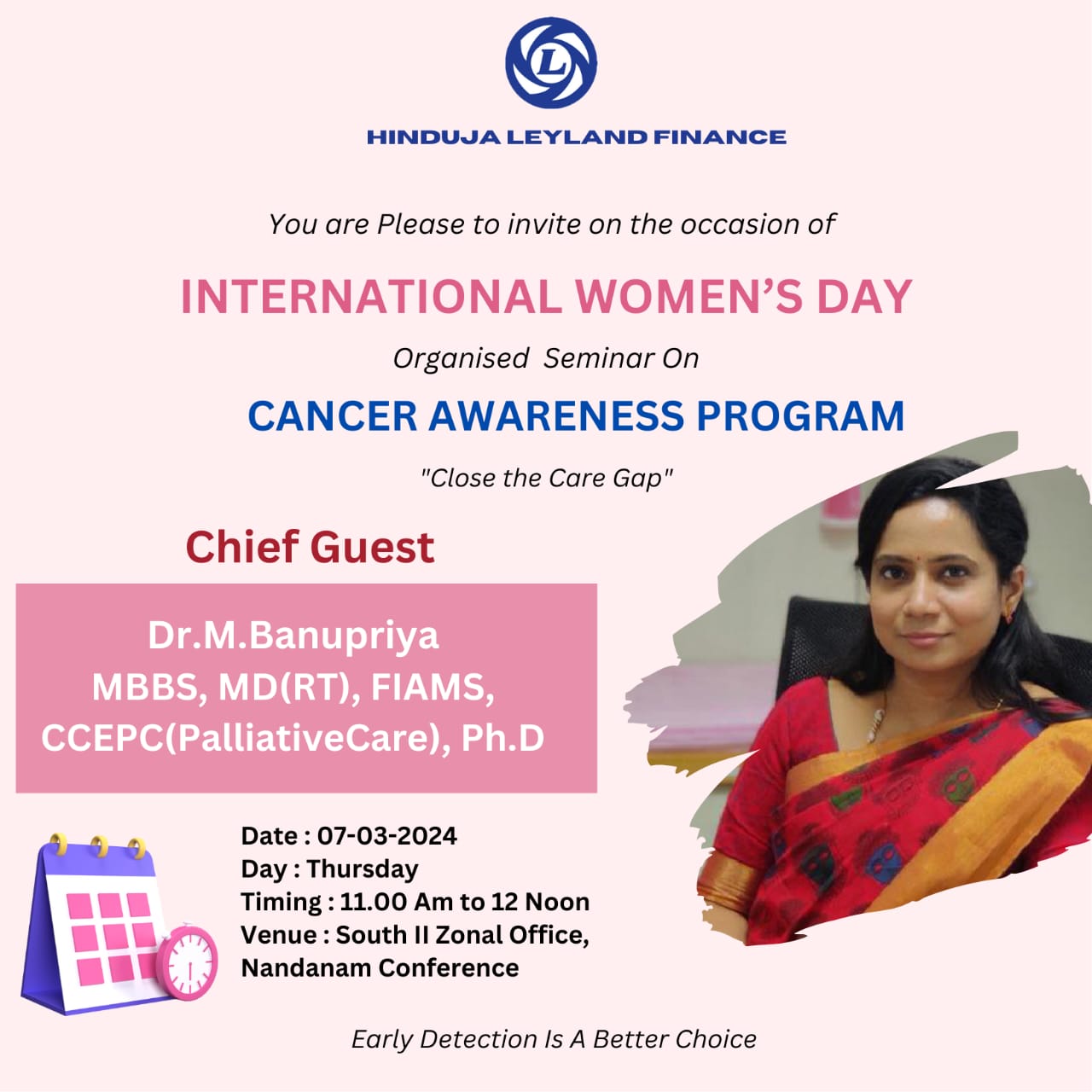 Cancer Awareness Program talk by Dr.Banu Priya was Conducted in Hinduja Leyland Finance Ltd at Nandanam Conference Hall on 07-03-2024