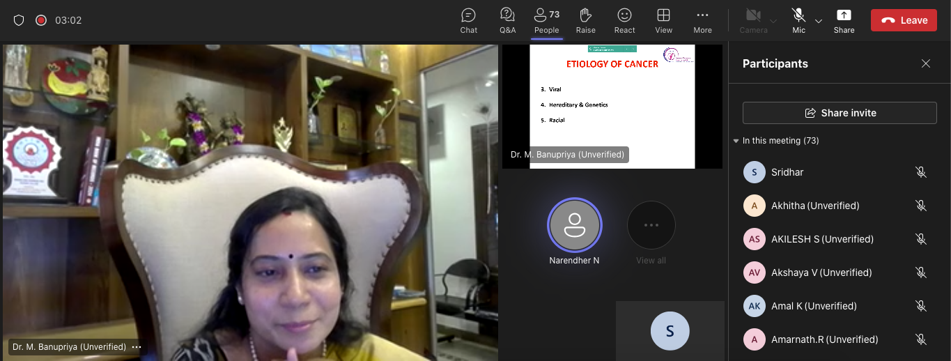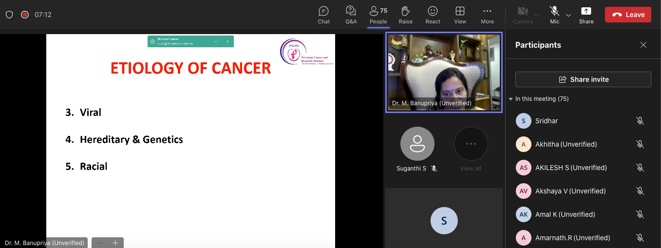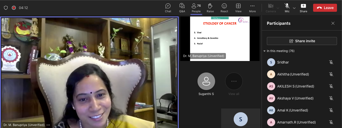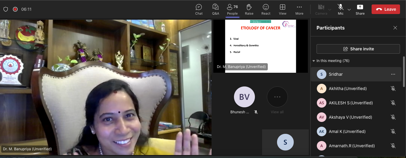 The Cancer Awareness Program for E Noah Solutions, conducted virtually by Dr. Banupriya of Privaram Cancer and Research Institute and organized by Kalpavriksham Trust, was a significant success. Held online around 80 people attended the event, the event focused on educating participants about cancer prevention, early detection, and the latest advancements in treatment. Dr. Banupriya's insightful presentation and interactive Q&A session provided valuable knowledge and encouraged proactive health management. The program highlighted the importance of cancer awareness and demonstrated E Noah Solutions' dedication to the well-being of its community.