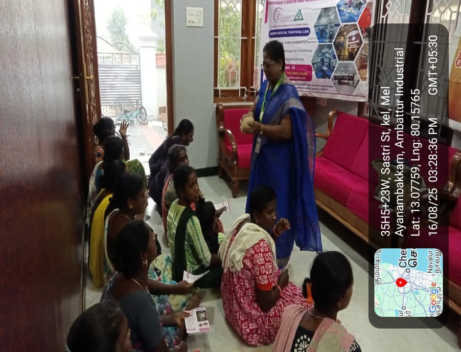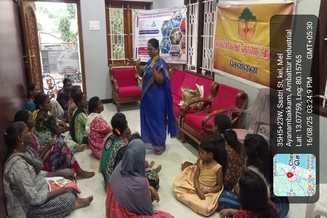 Kalpavriksham Trust, in collaboration with Privaram Cancer Hospital, conducted a Cancer Awareness Talk at Ayanambakkam.The session educated around 19 participants on the importance of mammogram and Pap smear tests, highlighting their vital role in early cancer detection. The speaker clearly explained the procedures and benefits of these screenings, encouraging participants to take proactive health measures.This initiative aimed to raise awareness about preventive healthcare, empowering the community to prioritize their health and well-being through timely screenings and informed choices.