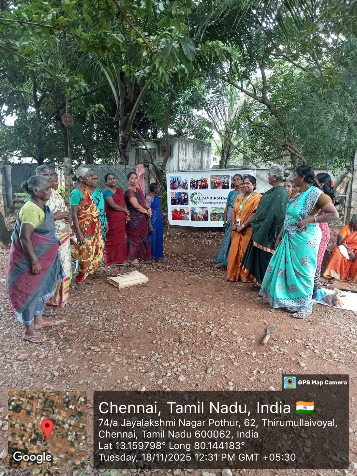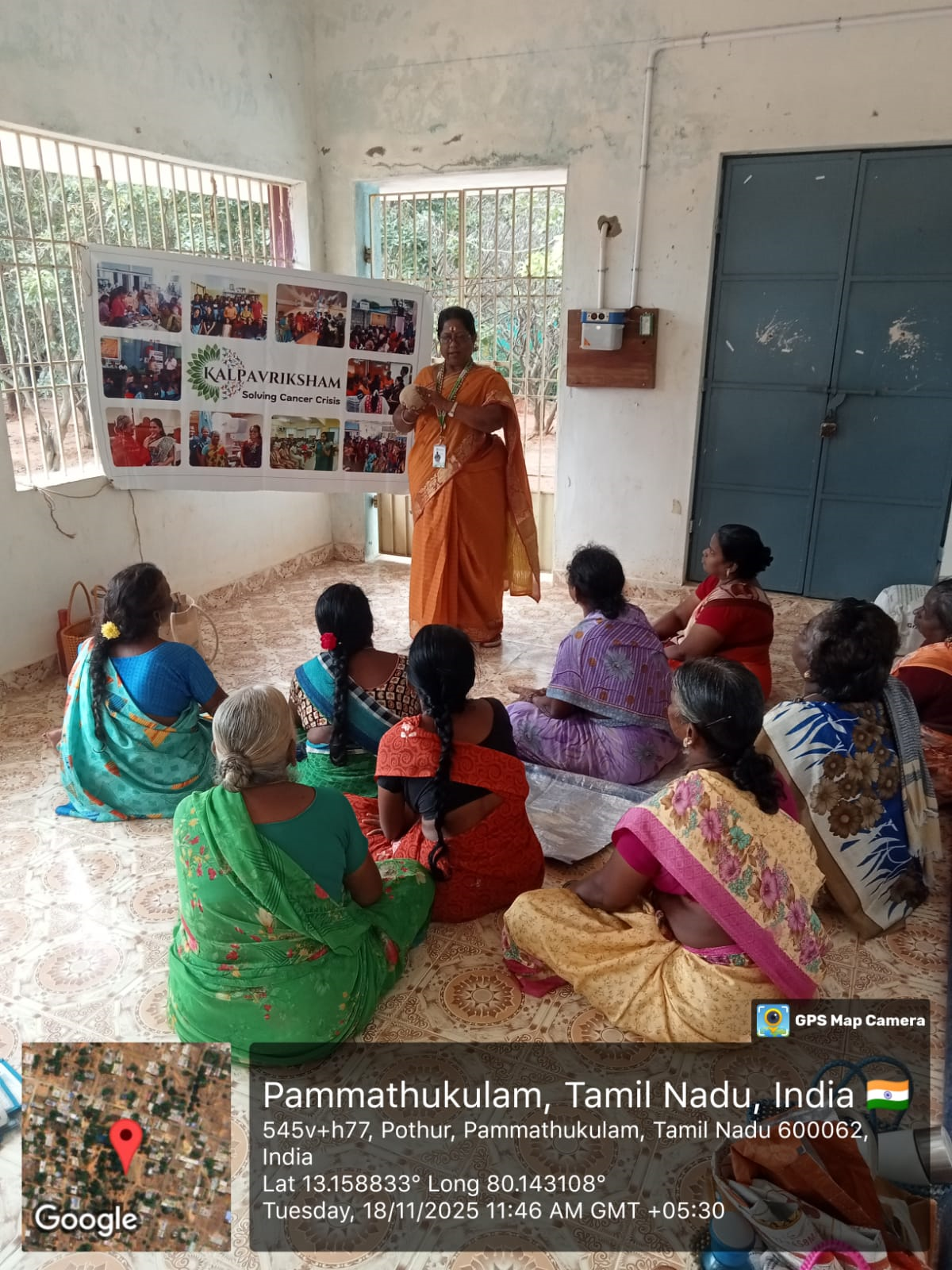 Kalpavriksham Trust, in collaboration with Privaram Cancer Hospital, conducted a Cancer Awareness Talk at the Panchayat Office & Jayalakshmi Nagar, Pothur – Thirumullaivoyal, on 18th November 2025. The session engaged 29 participants and emphasized the importance of mammogram and Pap smear screenings for the early detection and prevention of breast and cervical cancers.The speaker provided clear and practical insights into the screening procedures, their benefits, and the critical role of timely testing in safeguarding women’s health. Participants were encouraged to adopt proactive health practices and stay informed about preventive measures.This initiative aimed to empower the community with essential knowledge, promote regular screenings, and support informed health decisions for a healthier future.