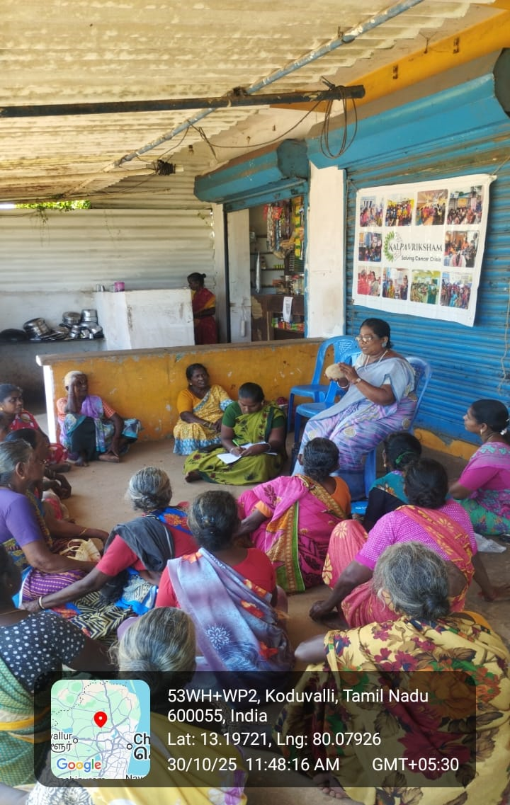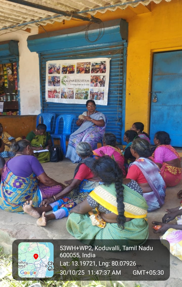 Kalpavriksham Trust, in collaboration with Privaram Cancer Hospital, organized a Cancer Awareness Talk at Pandeswaram Village, Thiruvallur. The session reached 20 women participants, emphasizing the importance of mammogram and Pap smear screenings for the early detection and prevention of breast and cervical cancers. The speaker provided clear and practical insights into the procedures, benefits, and necessity of these tests, inspiring participants to adopt proactive health practices. This initiative aimed to empower the community through awareness, encouraging timely screenings and informed health decisions, paving the way for a healthier future.