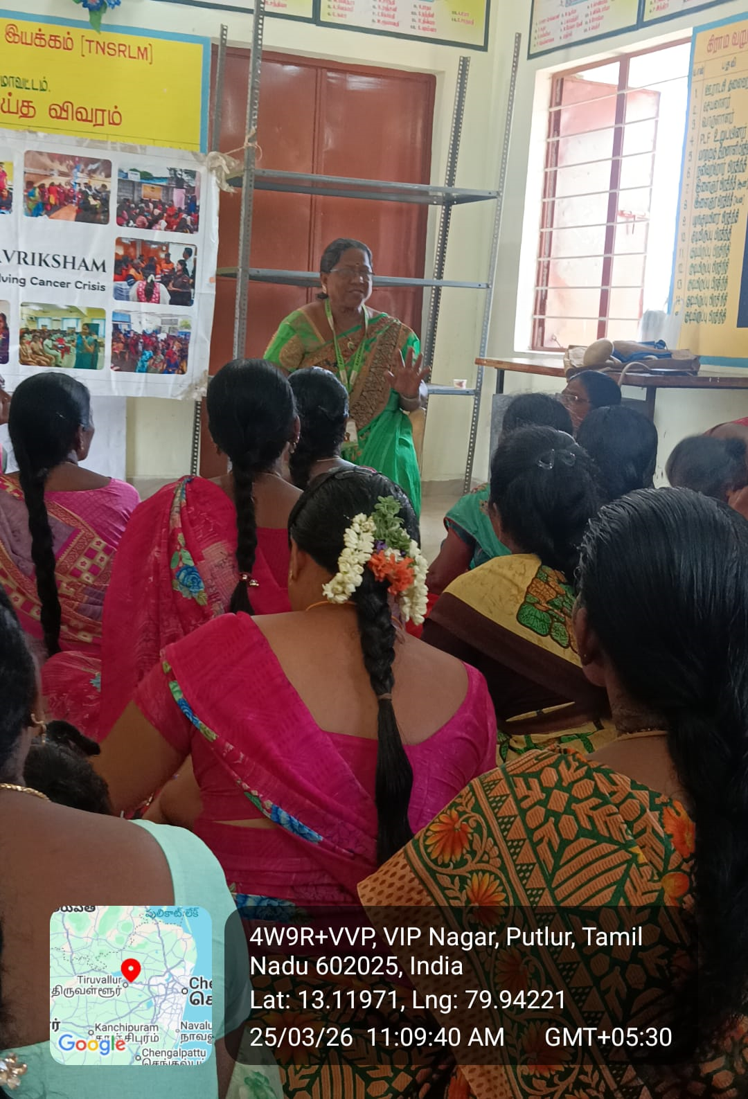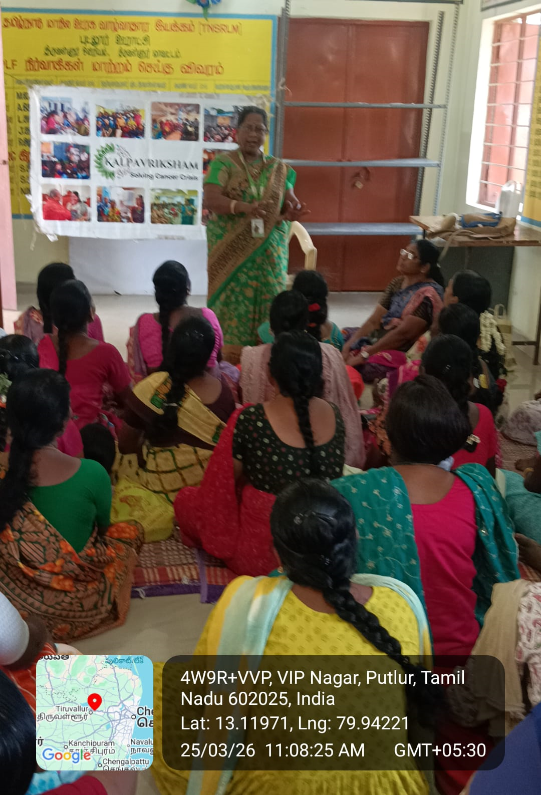 Kalpavriksham Trust, in collaboration with Privaram Cancer Hospital, organized a Cancer Awareness Talk at VPC Building, Putlur, Thiruvallur. The session educated 45 women participants on the importance of mammogram and Pap smear screenings, emphasizing their critical role in the early detection and prevention of breast and cervical cancers. The speaker provided clear insights into the procedures and benefits of these tests, motivating attendees to adopt proactive health practices. This initiative aimed to empower the community through awareness, encouraging timely screenings and informed health decisions for a healthier future.