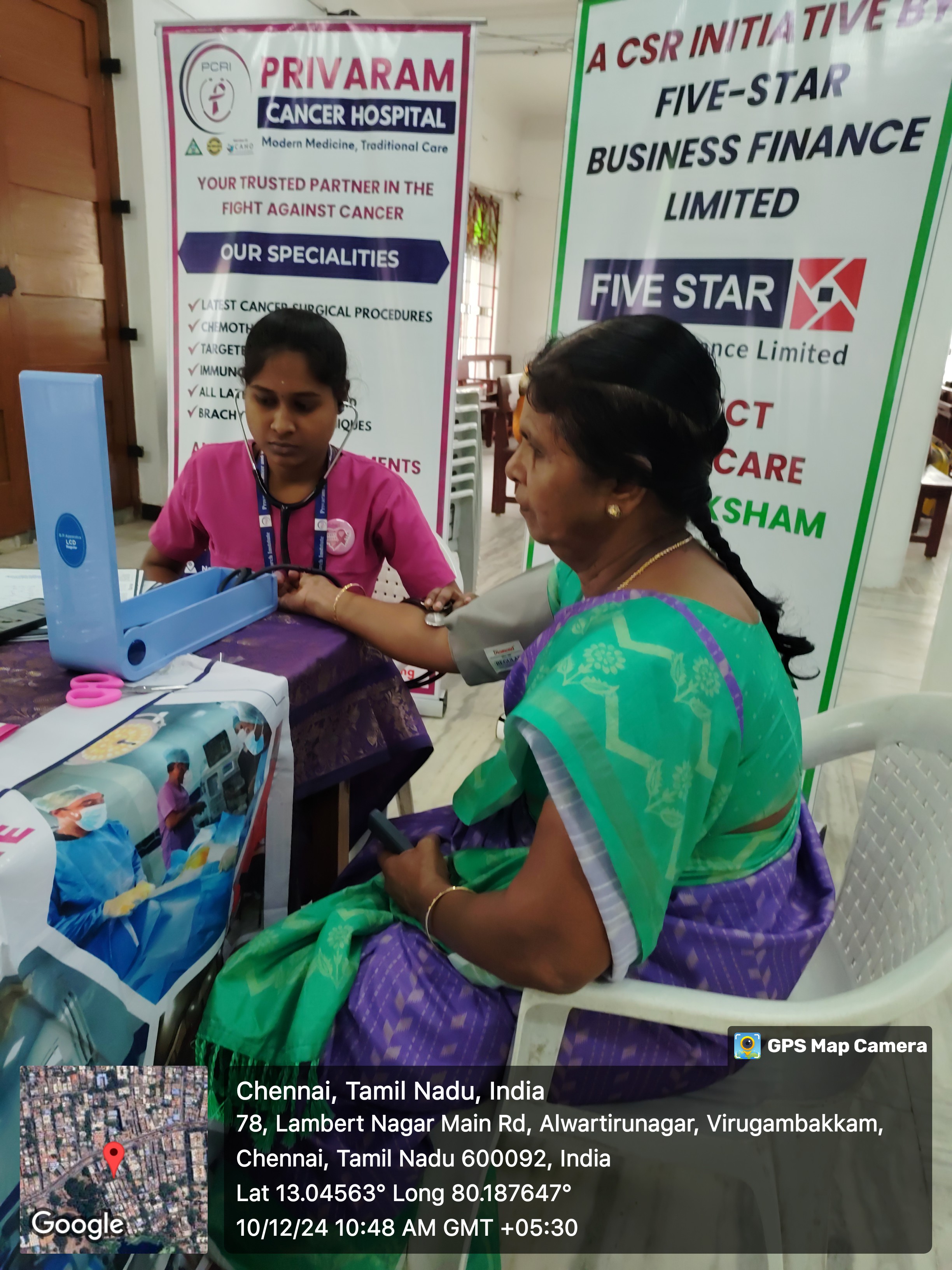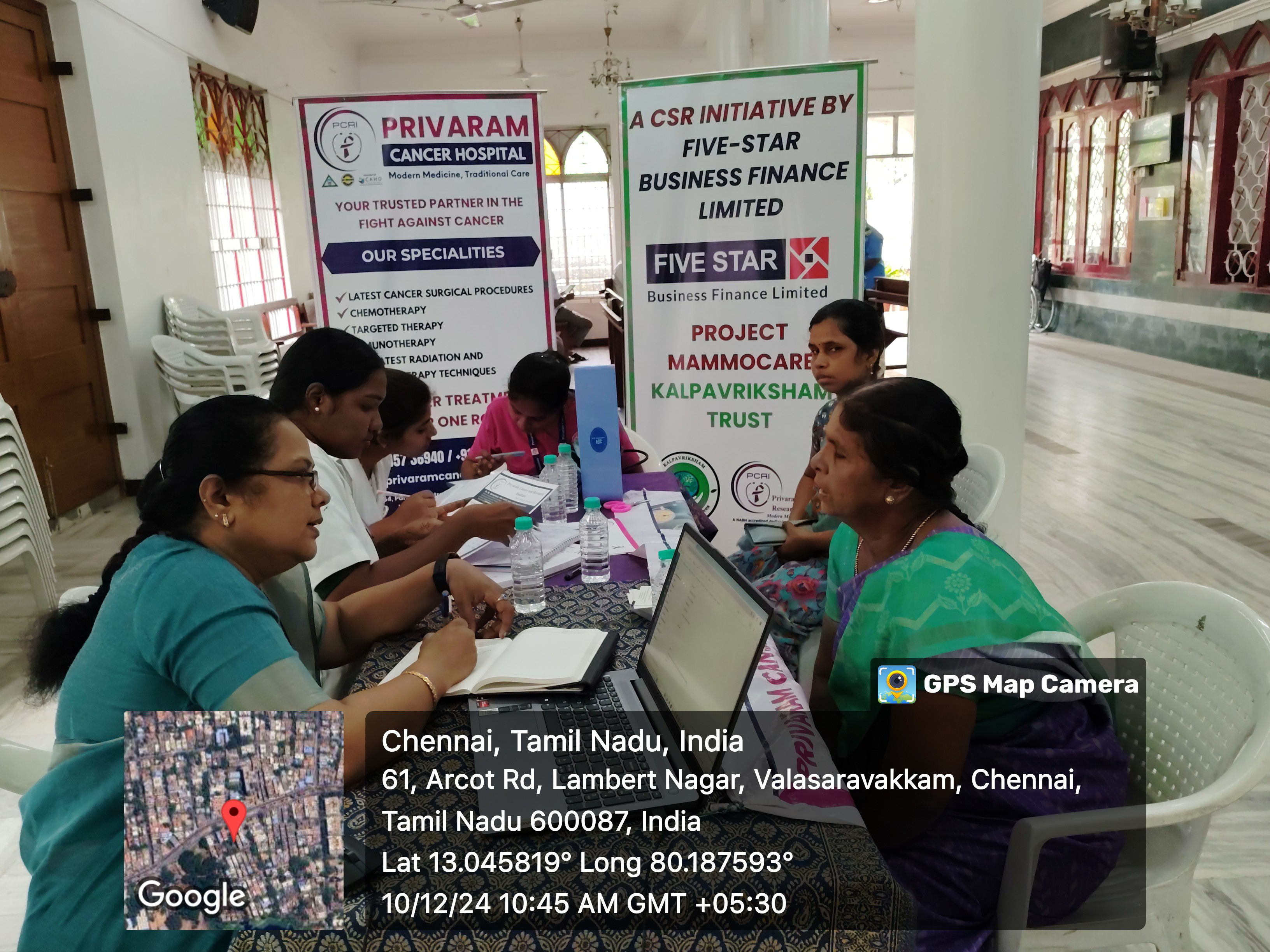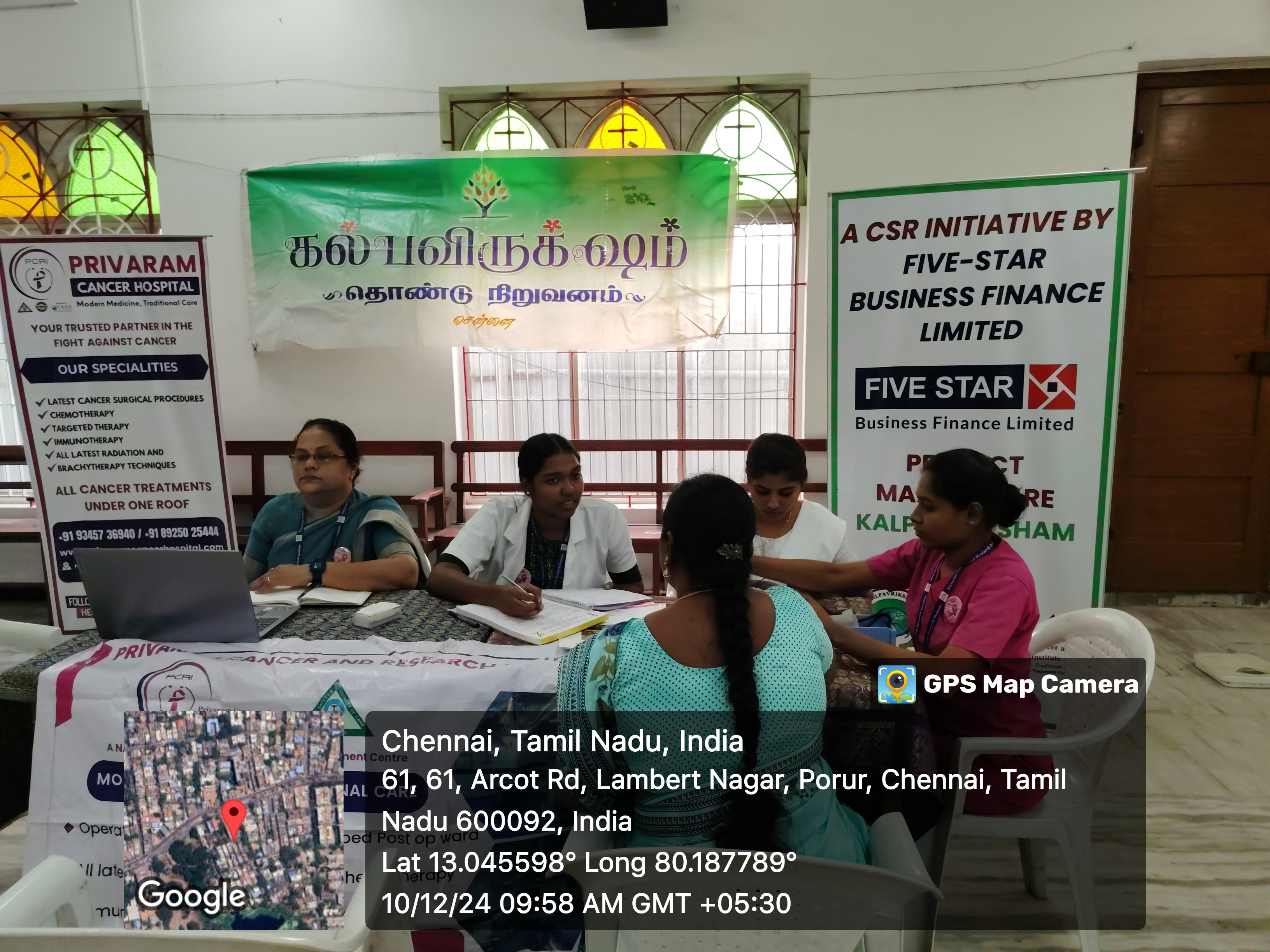 Kalpavriksham Trust and Privaram Cancer Hospital collaborated to conduct a cancer screening event at CSI Christ Church, Virugambakkam under Project Femicare +. The event was generously sponsored by Five Star Business Finance Limited through their CSR funds. This initiative benefited a total of 57 residents, including 46 Pap Smear and 39 Mammogram screenings.The camp aimed to provide essential preventive healthcare to the elderly, reaffirming our commitment to improving health awareness among vulnerable groups.