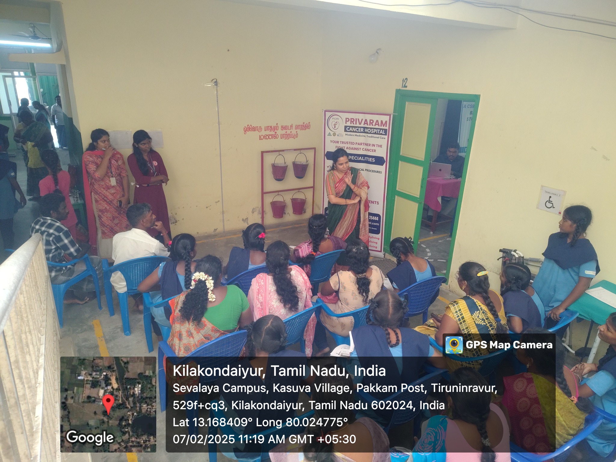 HPV vaccination camp and Menstrual Hygiene awareness talk organized at Kasuva Village. During this event, 70 HPV vaccines were administered to the students. In addition, we distributed sanitary pads among 70 girl students. To measure the effectiveness of the awareness talk, we provided a questionnaire to the students before the session and a post-session questionnaire to assess the knowledge they gained. This initiative aimed to promote health and hygiene and empower young women with vital information and resources.