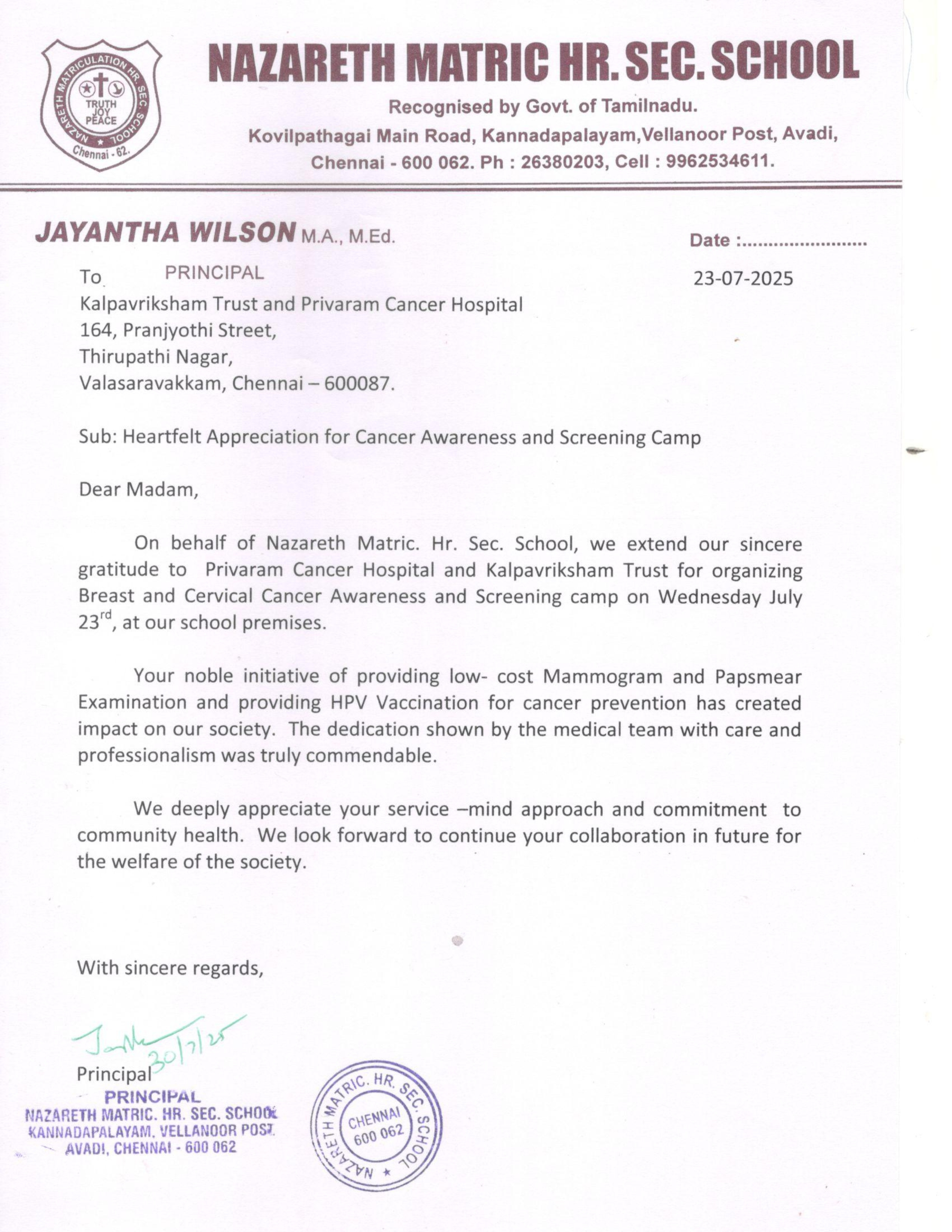 Appreciation Letter From Nazareth Matric Hr.Sec School- Avadi