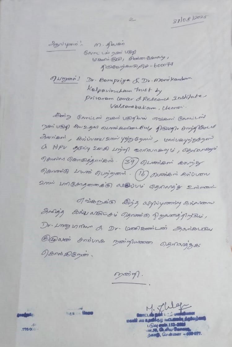 Appreciation Letter From Nithiya Malli Magalir Kuzhu - Ayanabakkam