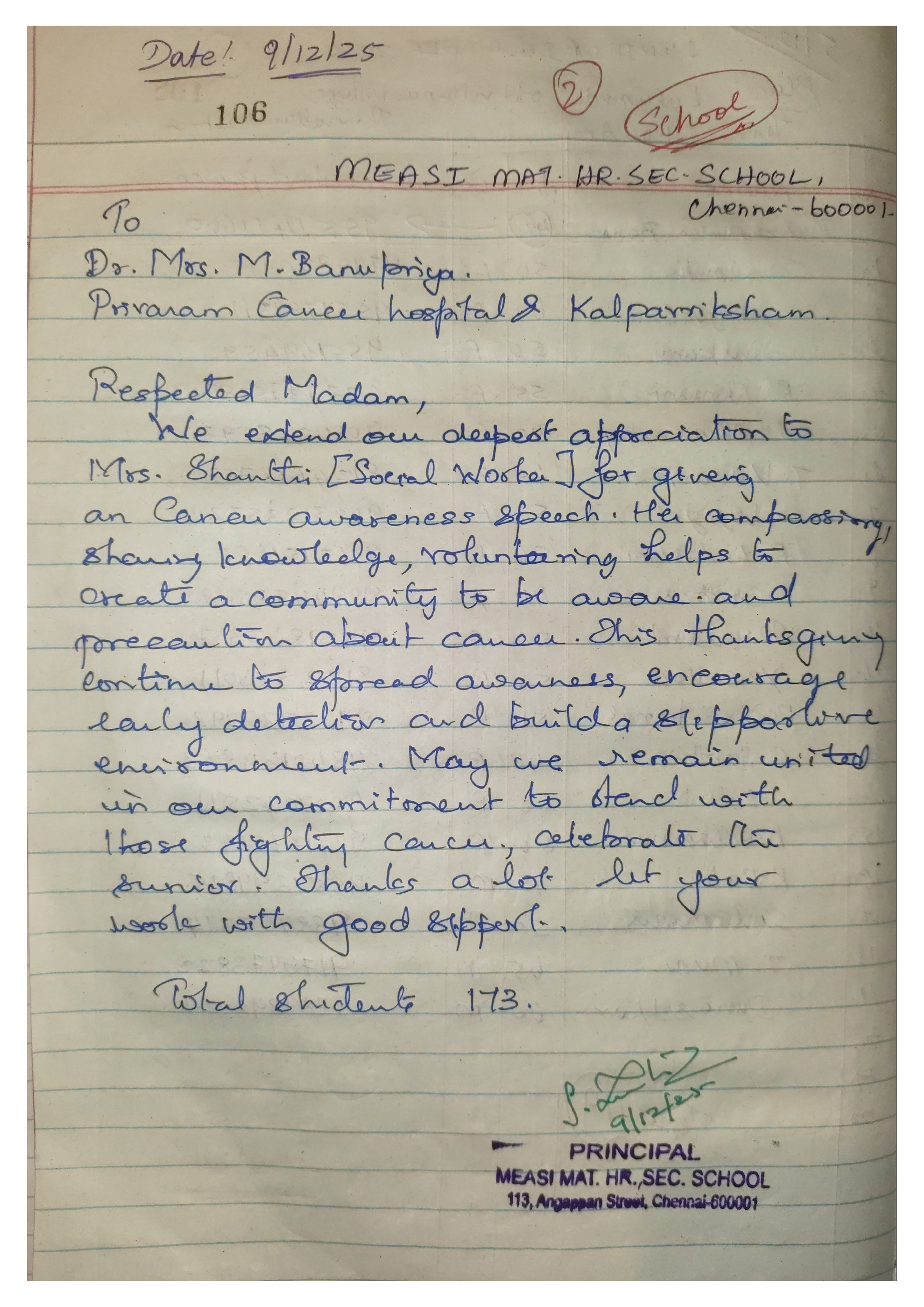 Letter of Appreciation from Measi Matriculation Hr. Sec. School, George Town, Chennai.