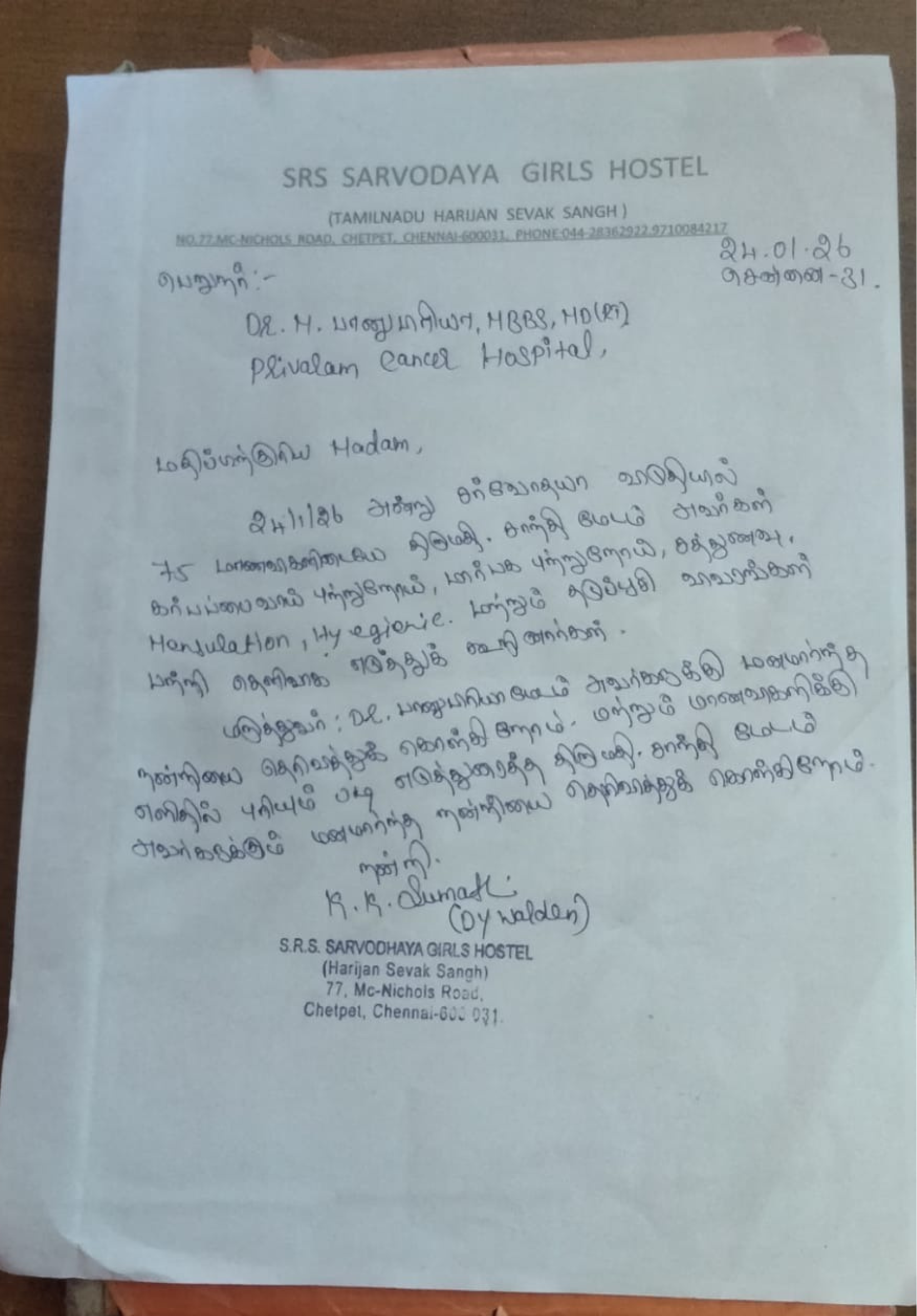 Letter of Appreciation from SRS Sarvodya Girls Hostel, Chetpet, Chennai.