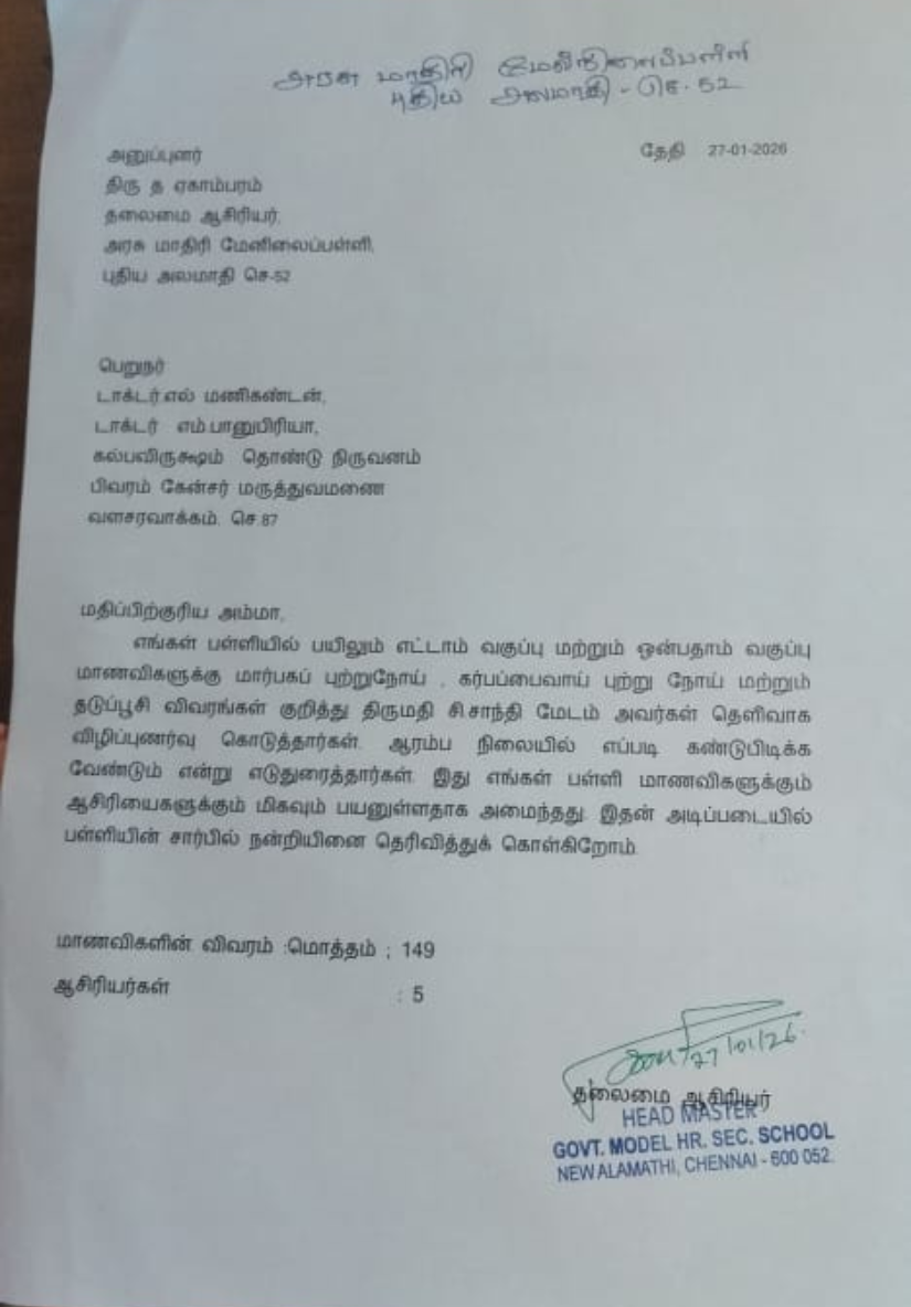 Letter of Appreciation from Government Higher Secondary School-Nemilichery, Thiruvallur.